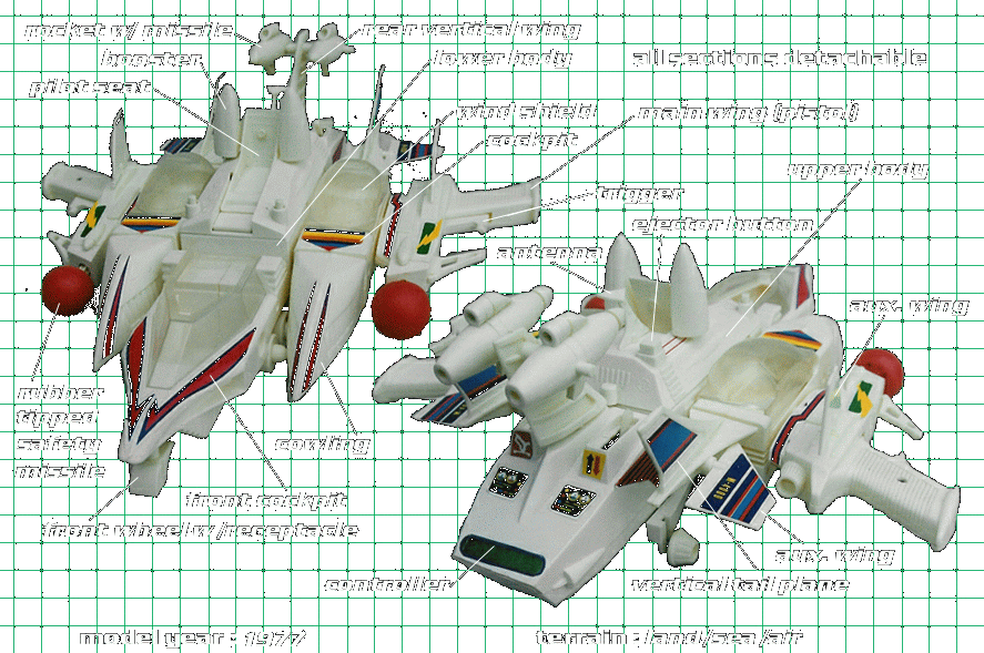 The Battle Cruiser was also packaged with a sticker and instruction sheet. Battle Cruiser parts breakdown: 1 "radar" plank, 1 large vertical wing, 1 connecting arm, 1 "magic hand" claw, 1 ultra joint, 2 vertical planes, 1 front wheel, 1 twin joint, 2 chassis wheel holders, 8 main wheels, 8 main wheel retainers, 1 ejector seat, 2 "rocket" missile launchers, 1 "engine" fin with control wire, 3 hand joint connectors, 2 "propulsion unit adaptors" or large L-pegs, 4 fins, 2 wing cockpits, 2 wing cockpit canopies, 2 booster cones, 5 small missiles, 1 drill cone, 1 "antenna" fin, 2 main wing pistols, 1 upper middle body section, 1 lower middle body section with motor, 1 front wheel receptacle, 2 auxiliary tire receptacles, 2 large rubber tipped missiles, 1 controller box, 1 front body section, 2 nose cone cowlings, 2 "miracle" elbow joints |