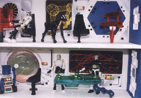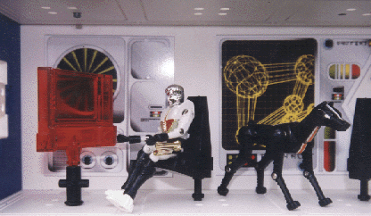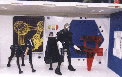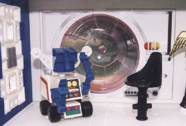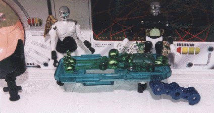M-180 Maria and M-160 Egypton examine a green Birth of Acroyear . The examination table is actually half of the capsule the Acroyear came in with a little help from a Hydra support arm. Next is a slightly closer interior view of the big schnozzed Spyroid robot from the Microman Suveyor 2 vehicle. IPHQ dome is in the background and also an Astrostation chair thrown in. |